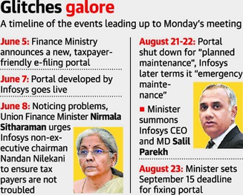 After over two-and-a-half months of continuing glitches in the revamped e-filing portal of the Income Tax Department, and its unavailability over the last two days, Finance Ministry officials held two meetings with Infosys MD & CEO Salil Parekh.